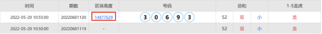 在下一个开奖时间后,最快收到的特定区块高度,将使用它的哈希值作为开奖结果。